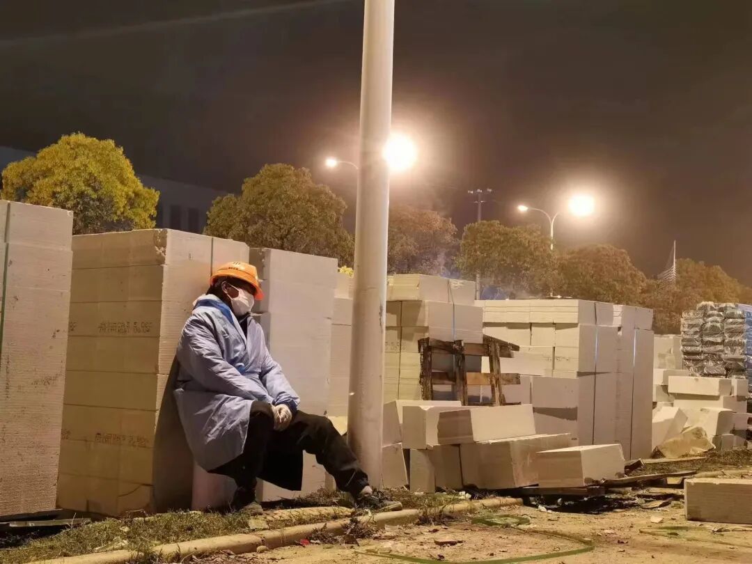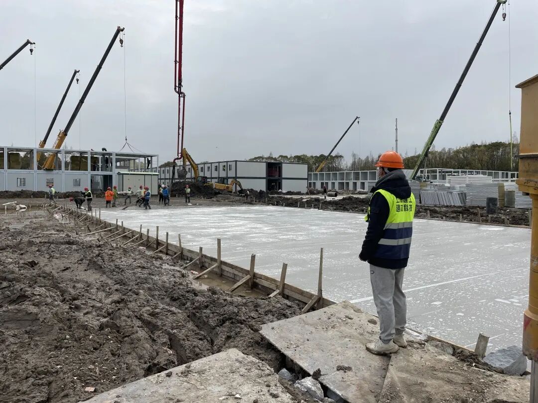 自临港方舱医院开工以来,材七公司副总经理周达和总工程师卢金国日夜奋战,每天都坚守至凌晨。开工当日恰逢上海大风、雷电、暴雨三预警同时高挂,在工地现场,拥有多年现场调度经验的陈庆飞、付正等人身披雨衣,脚踩淤泥,喉咙喊到沙哑,却仍然清晰地指挥着每一台搅拌车的行车路线。午夜,趁换班间隙,现场调度潘向明靠在工地一角稍作休息,随着下一辆搅拌车的驶入,他的工作还将继续。