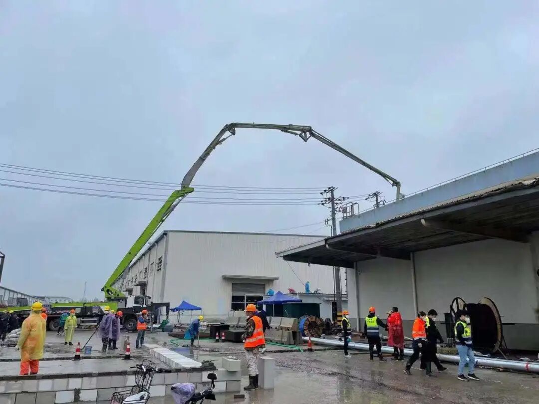 机运公司党总支副书记、总经理辛明华在高桥港应急隔离点保供准备会议上强调:“混凝土不断档,我们的泵车也绝不能拖后腿,务必集中最优质的泵送资源,全力保供好应急隔离点的建设。”开工当日,机运公司浦东站副经理唐明第一时间到达施工现场,下雨路面泥泞,他仍然坚持一步步走到每台泵车旁,再三叮嘱泵车驾操人员,切记做好个人防护,确保施工安全。