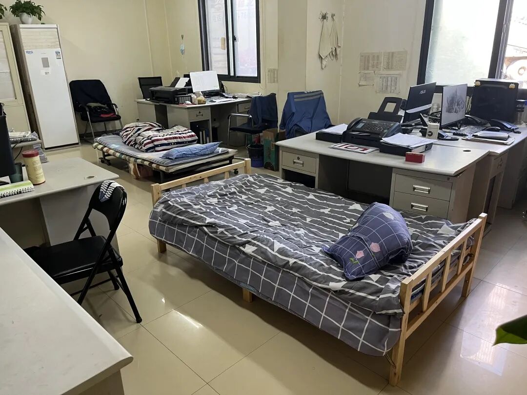 材五公司共有300多名员工驻守在搅拌站内,他们不计得失、不辞辛苦、默默奉献,临时订购的床铺、会议室里的沙发、甚至于几个拼凑的椅子成为了他们休息的地方,只为应急隔离点尽早完工、尽早收治。历时一周的时间,顺利完成高桥港应急隔离点约1.8万方混凝土的浇捣任务。